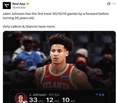 空砍33分12板10助3断华丽数据,新鹰王杰伦约翰逊成詹姆斯与字母哥后历史第三人!倒数第一爆冷赢球送6连胜黄蜂神助攻。