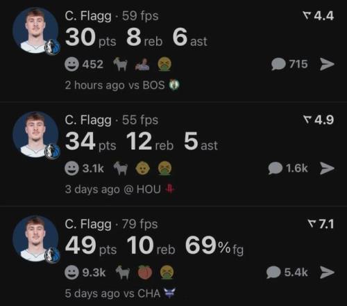 赛季至今,弗拉格为独行侠首发出战46场比赛。场均出战34.1分钟,得到20.1分6.7篮板4.2助攻1.2抢断0.8盖帽2.2失误,三项命中率:48.4%,29.4%,80.2%。场均得分2025届新秀第一,篮板同届第二,助攻同届第三。