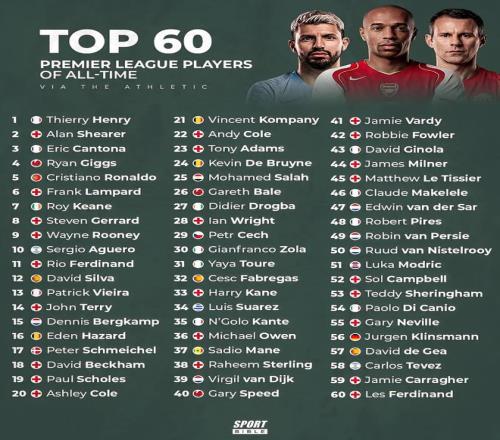 《The Athletic》评选了英超历史60大球星,其中亨利、阿兰-希勒、坎通纳排名前三,C罗第五,萨拉赫排在第25位。