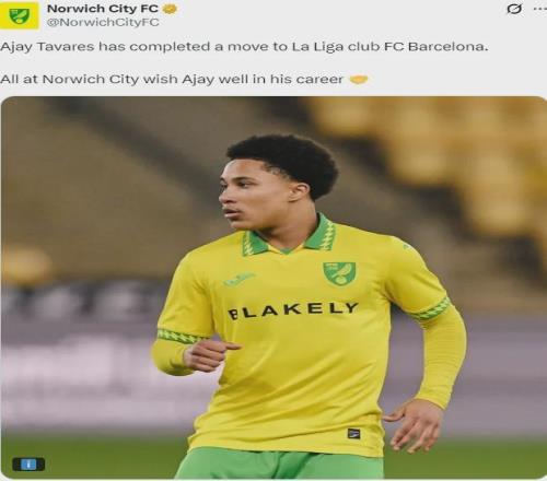 官方:诺维奇宣布年轻的边锋阿贾伊-塔瓦雷斯转会加盟了巴萨。