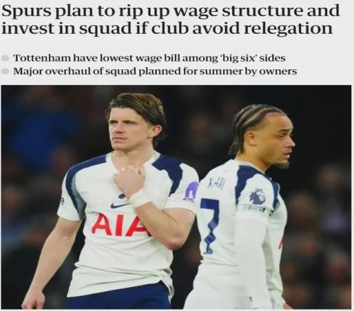 卫报记者MH消息,热刺老板准备打破俱乐部僵化的薪资结构,假如本赛季能避免降级,那么他们将在夏天来临之前付诸行动。