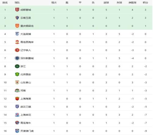 中超第一轮安排在三个比赛日进行,揭幕战成都蓉城对阵深圳新鹏城,深圳在阿利米先进一球的情况下错失好局,姜至鹏被红牌罚下,席尔瓦扳平比分,费利佩和胡荷韬进球完成反超。多打一人的成都蓉城在下半场连续进球,席尔瓦梅开二度,廖荣祥进球,最终成都蓉城5比1击败深圳,取得开门红,拿到4个净胜球,排名第一位。