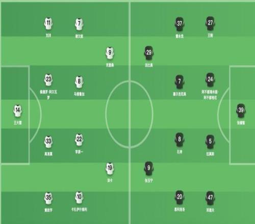 山东泰山首发:14-王大雷、11-刘洋、23-佩德罗-阿尔瓦罗、33-高准翼、35-黄政宇、7-谢文能、8-马德鲁加、22-李源一、10-卡扎伊什维利、9-克雷桑、19-泽卡