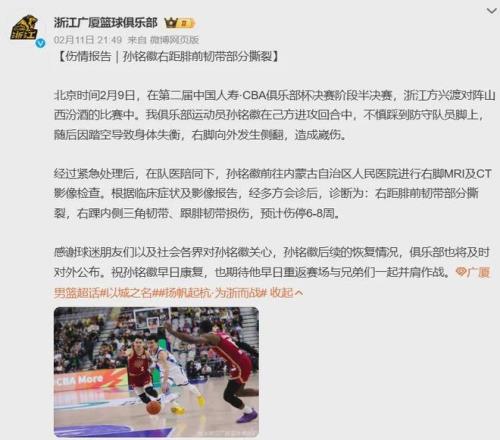 值得一提的是,胡金秋之前,广厦队已失去了外线核心孙铭徽,后者由于遭遇了右距腓前韧带部分撕裂,右踝内侧三角韧带、跟腓韧带损伤,仍处于伤停状态。