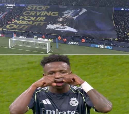 维尼修斯在比赛第22分钟造点,曼城中场伯纳多-席尔瓦被红牌罚下,在打入点球后,维尼修斯用带有回应意味的庆祝动作宣泄情绪。进球后做出“让你哭”的庆祝,疑似是在回应曼城球迷上赛季为他准备的以罗德里金球奖为主体的Tifo,同时配有文字:别再伤心哭泣了。