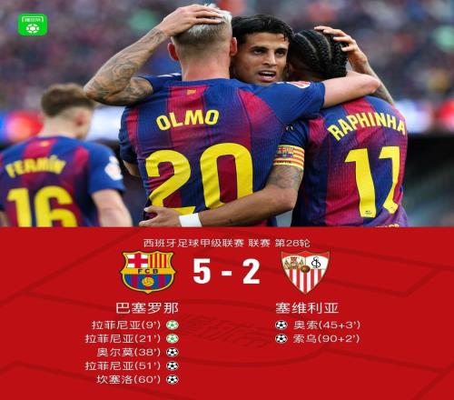 诺坎普狂欢!巴萨52大胜塞维利亚,拉菲尼亚9.9分成全场最佳