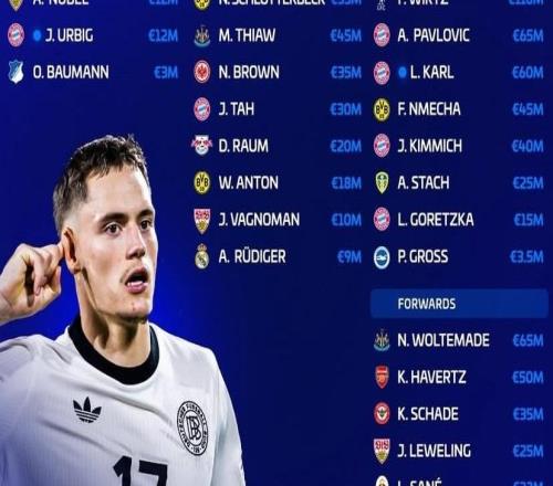 新一期德国队身价榜:维尔茨1.1亿第1,沃尔特马德6500万第2