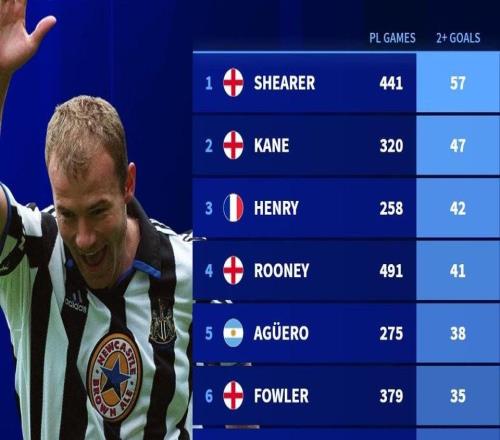 英超历史单场进球2+排行榜:希勒57场第1,凯恩第2,亨利第3